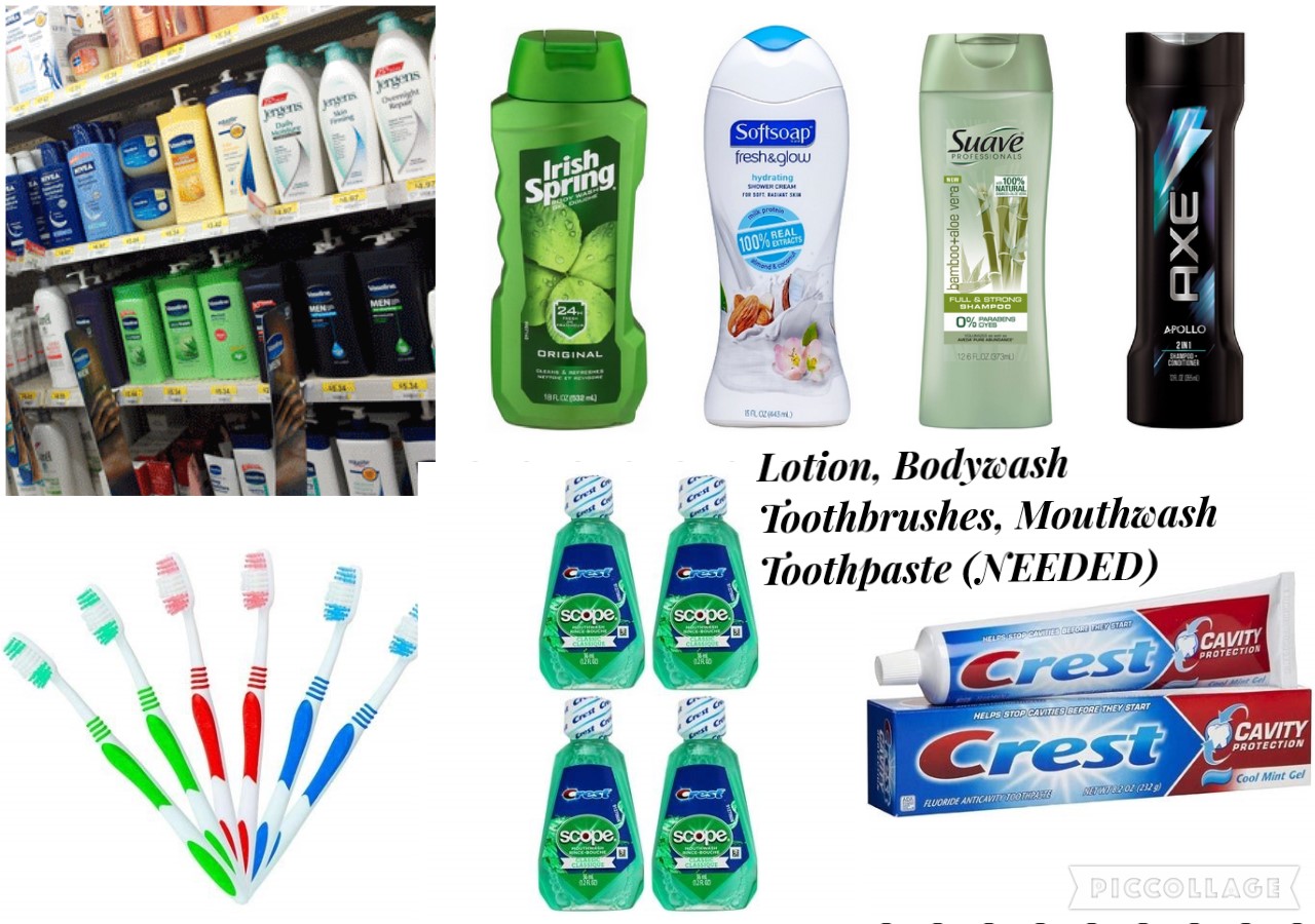 Lotions, Body Wash, Shampoos, Conditioners, Toothbrush, Mouthwash, and Toothpaste